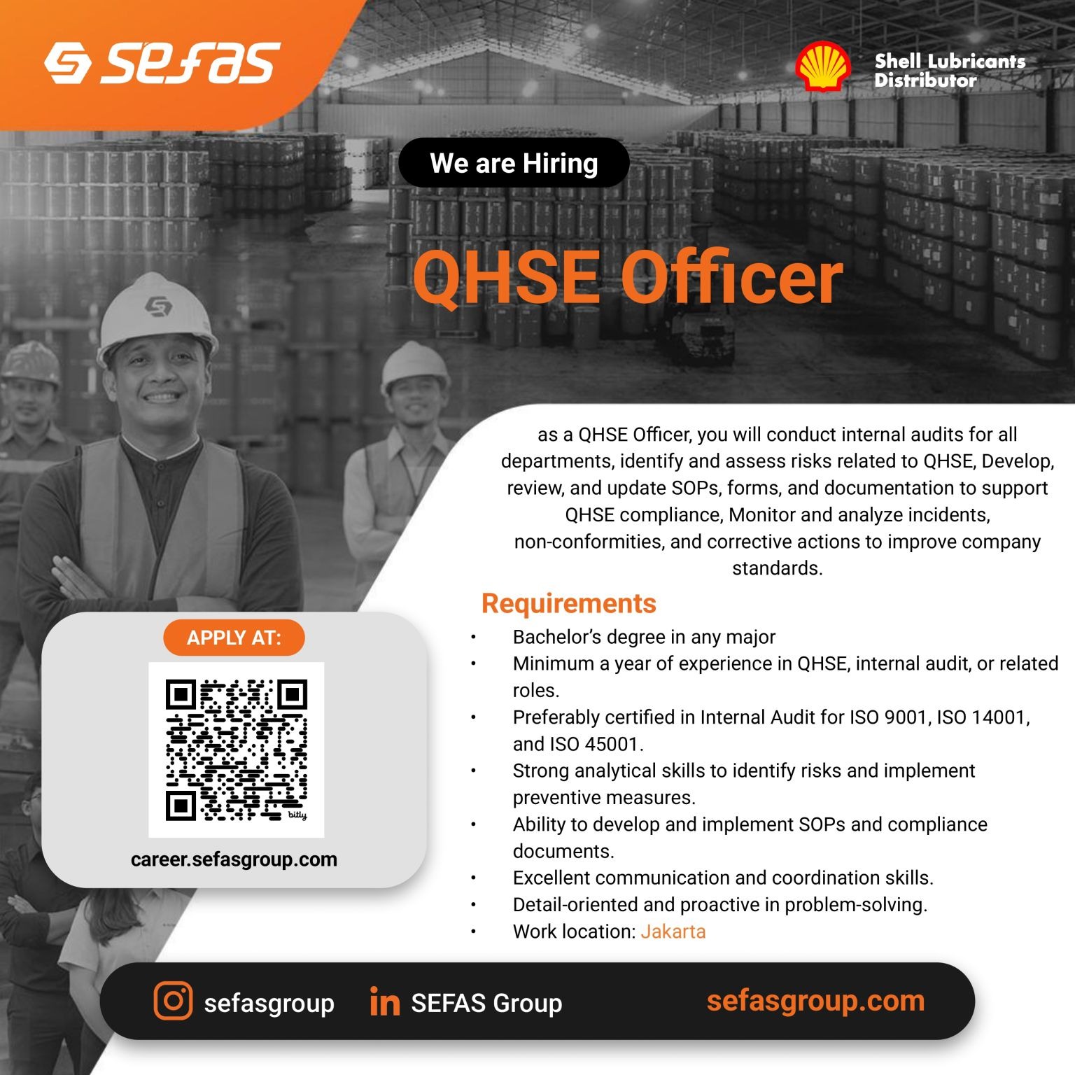 SEFAS Group, sebagai Shell Lubricants Distributor, saat ini membuka kesempatan karier bagi profesional yang berpengalaman di bidang QHSE, internal audit, dan pengembangan sistem manajemen.