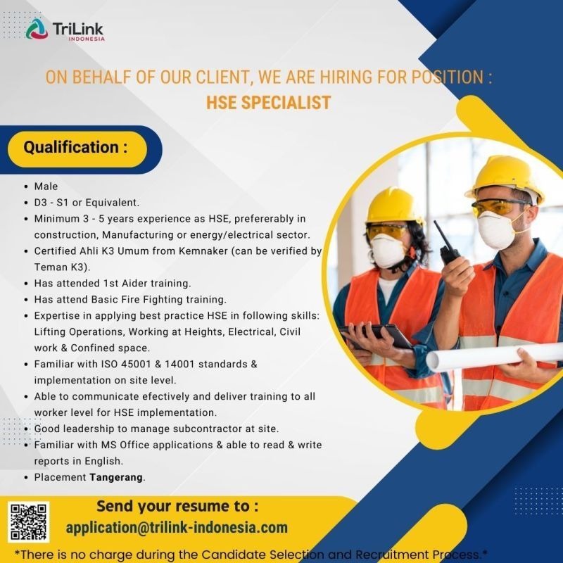 TriLink Indonesia, on behalf of our client, membuka Lowongan HSE Specialist untuk penempatan di area Tangerang. Posisi ini ditujukan bagi profesional K3 yang berpengalaman di proyek konstruksi, manufaktur, maupun sektor energi/listrik dan siap memimpin implementasi HSE di lapangan.