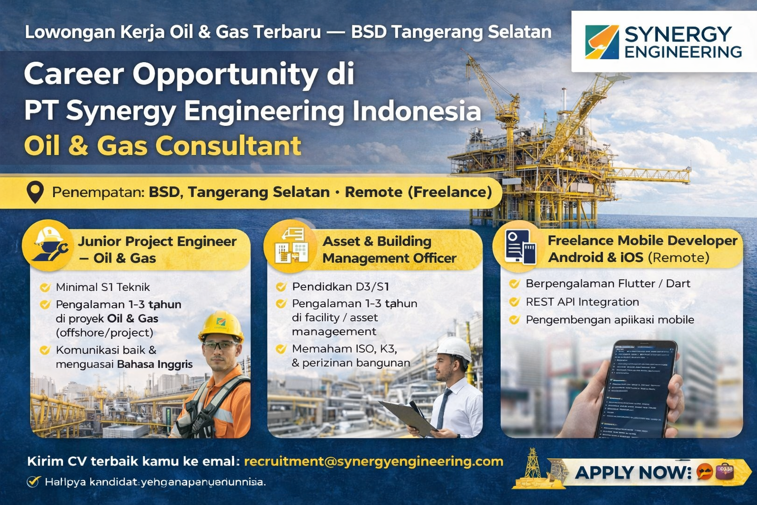 PT Synergy Engineering Indonesia, perusahaan Oil & Gas Consultant, saat ini membuka lowongan kerja terbaru bagi profesional dan talenta terbaik untuk bergabung dan berkembang bersama tim.