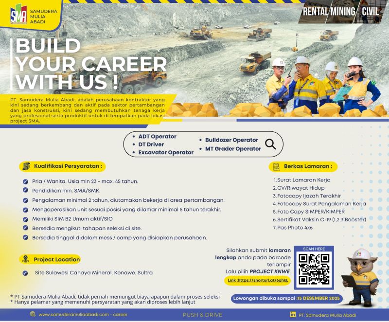 Jika Anda memiliki pengalaman sebagai operator alat berat di area tambang dan ingin mengembangkan karier, inilah kesempatan terbaik untuk bergabung bersama PT Samudera Mulia Abadi.