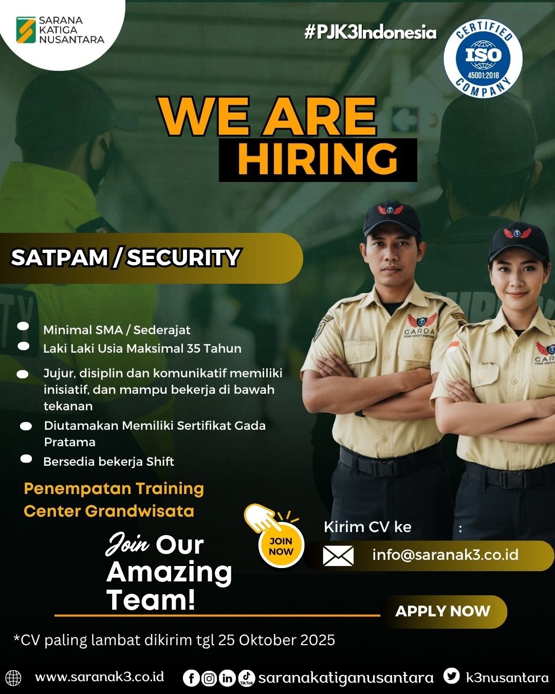 Bersama Sarana Katiga Nusantara, jadilah bagian dari tim profesional yang menjaga keamanan dan kenyamanan di lingkungan kerja!