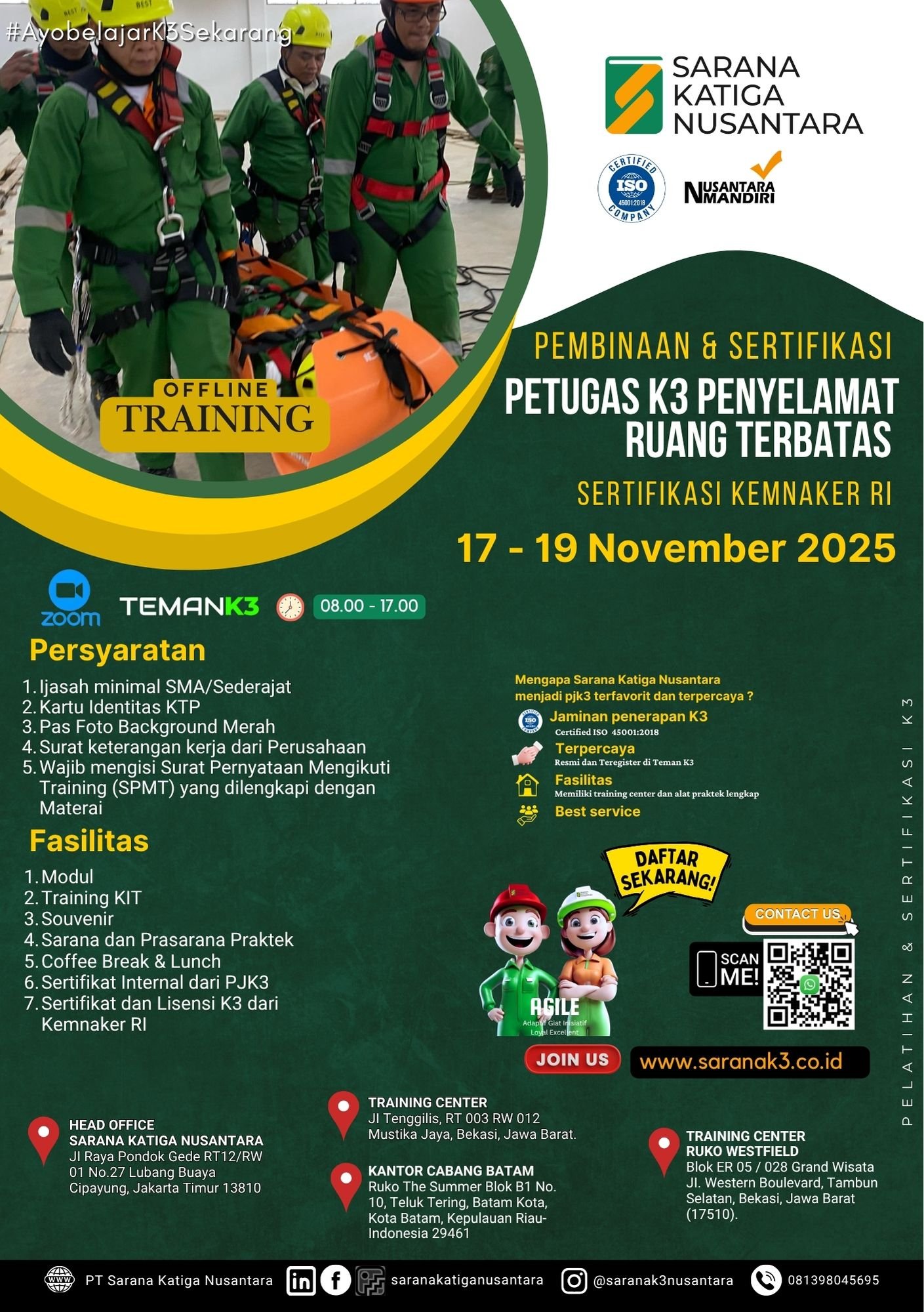 Seperti diketahui bersama, ruang terbatas (confined spaces) mengandung beberapa sumber bahaya baik yang berasal dari bahan kimia yang mengandung racun dan mudah terbakar dalam bentuk gas, uap, asap, debu dan sebagainya. Selain itu masih terdapat bahaya lain berupa terjadinya oksigen defisiensi atau sebaliknya kadar oksigen yang berlebihan, suhu yang ekstrem, terjebak atau terliputi (engulfment), maupun resiko fisik lainnya yang timbul seperti kebisingan, permukaan yang basah/licin dan kejatuhan benda keras yang terdapat di dalam ruang terbatas tersebut yang dapat mengakibatkan kecelakaan kerja sampai dengan kematian tenaga kerja yang bekerja di dalamnya. Oleh sebab itu diperlukan Petugas Penyelamat Ruang Terbatas yang terlatih dan kompeten. Untuk mendapatkan keahlian dan kompetensi mengenai Confined Space Rescue, Perusahaan dapat mengikutsertakan karyawannya mengikuti pelatihan dan sertifikasi di PT Sarana Katiga Nusantara. Sebagai perusahaan jasa pelatihan yang mengutamakan kualitas dalam setiap pelaksanaannya.