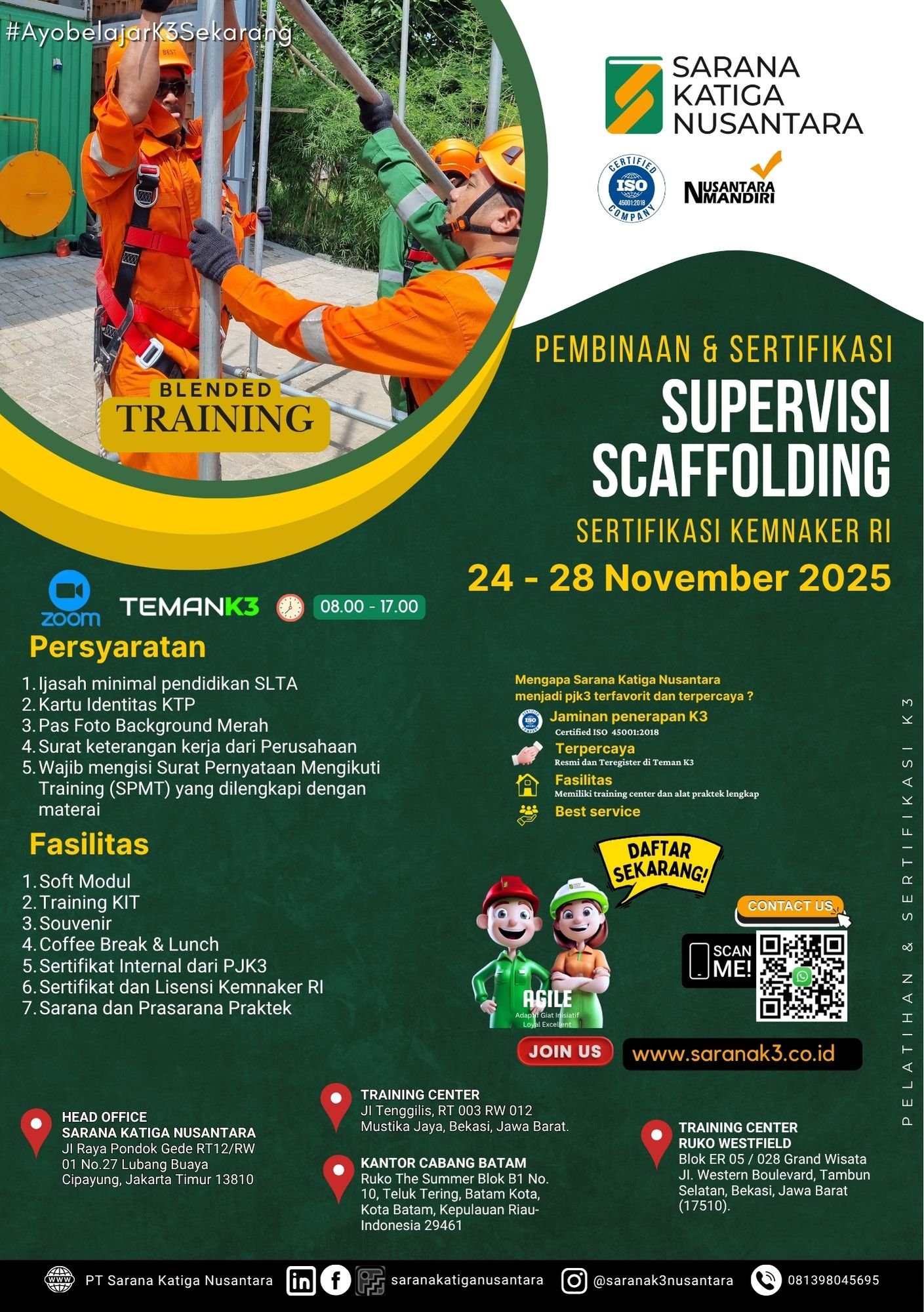 SERTIFIKASI Seluruh peserta yang mengikuti pelatihan supervisi perancah akan memperoleh sertifikat kehadiran yang akan ditandatangani elektronik tersertifikasi. Seluruh peserta yang telah dinyatakan lulus dalam pelatihan akan memperoleh Sertifikat & Lisensi dari Kemnaker RI. DURASI PELATIHAN pelatihan supervisi perancah memiliki durasi pelatihan selama 5 Hari : 1. Hari Pertama Online Training 2. Hari Kedua Online Training 3. Hari Ketiga Online Training 4. Hari Keempat Online Training 5. Hari Kelima Offline Training LOKASI PUBLIK TRAINING PT Sarana Katiga Nusantara (Grandwisata) Di Ruko Westfield Blok ER05/028 Grandwisata, Jl. Western Boulevard, Tambun Selatan, Bekasi. Group Nusantara (Batam) Di Ruko The Summer Blok B1 No 10 Batam Center, kel. Telur tering, kec.batam kota 29461. PERSYARATAN PESERTA Dengan persyaratan minimal SLTA atau sederajat. Adapun persyaratan yang dibutuhkan lainnya adalah sebagai berikut : · Menyerahkan Fotocopy Ijasah minimum SLTA/Sederajat · Menyerahkan Foto Copy Kartu Identitas · Membawa Pas Foto 4×6, 3×4, 2×3 masing-masing 3 lembar (background merah) · Menyerahkan Surat keterangan dari Perusahaan. · Menggunakan laptop pada hari ke 4 pada saat evaluasi · Memiliki Handphone Android / Laptop dengan koneksi internet yang baik · Mengikuti training sesuai waktu yang telah dijadwalkan